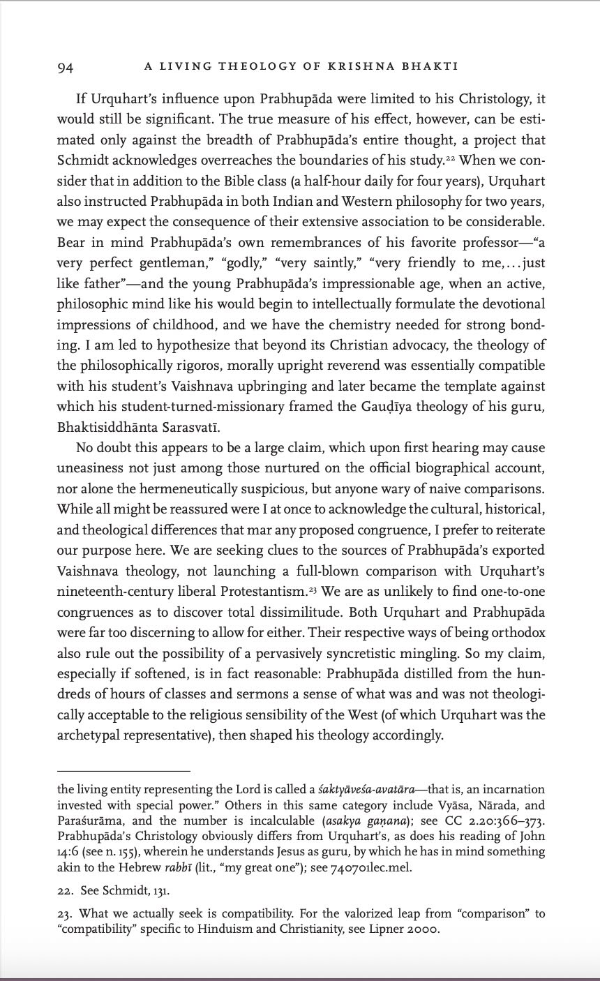 "Si la influencia de Urquhart sobre Prabhupada se limitara a su cristología, aun así sería significativa. La verdadera medida de su efecto, sin embargo, solo puede evaluarse en relación con la amplitud del pensamiento complet...